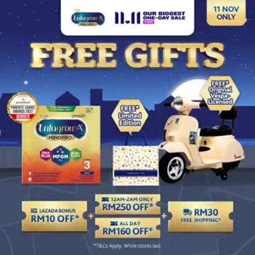 Online exclusive STACKABLE Gifts with Purchase: FREE* Vespa motorbike for kids AND Christy Ng x Enfagrow A+ MindPro grocery tote bag when you spend a minimum of RM1400 on selected products.FREE* Limited Edition Christy Ng x Enfagrow A+ MindPro grocery tote bag when you spend a minimum of RM700 on selected products.Up to RM250 off* voucherRM10 Every RM100 Spend Lazada BonusSave RM30 on ShippingLazada livestream (2pm, 11th November) where customers can stand a chance to win RM30 Lazada vouchers*Presales Specials (from 25th October till 10 November): FREE 3-in-1magnetic board, building foam blocks with purchase of selected products. Up to 25% savings in bundles.